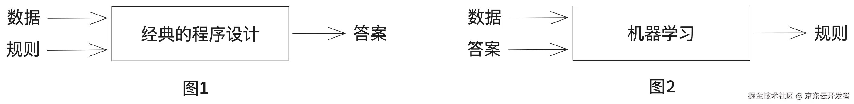 图2:机器学习把这个过程反了过来:机器读取输入数据和相应的答案,然后找出应有的规则。机器学习系统是训练出来的,而不是明确的用程序编写出来。举个例子,如果你想为度假照片添加标签,并希望将这项任务自动化,那么你可以将许多人工打好标签的照片输人机器学习系统,系统将学会把特定照片与特定标签联系在一起的统计规则。