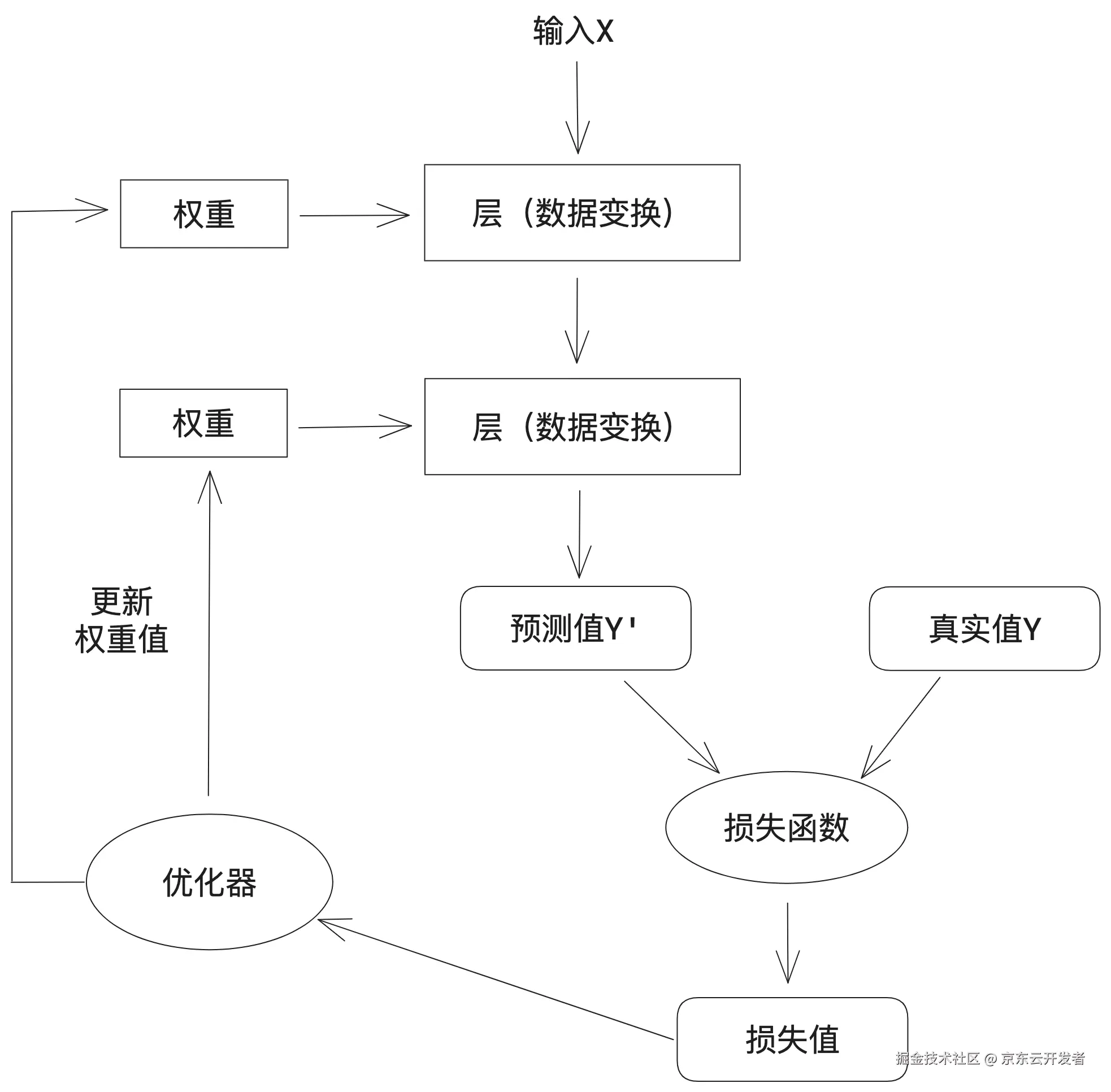 d. 将损失值作为反馈信号,通过优化器来对权重值进行微调,以降低当前示例对应的损失值