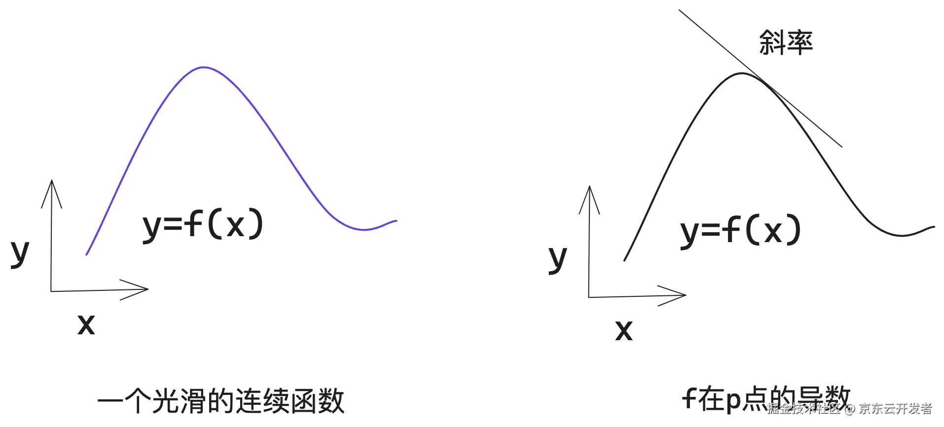 假设有一个光滑连续的函数f(x) = y,由于函数是连续的,因此x的微小变化只会导致y的微小变化。因此在某个点p附近,如果x变化足够小,就可以将f近似看作斜率为a的线性函数。