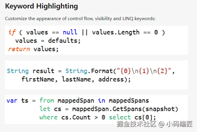 智能格式化: 使用 Roslyn 编译器框架深入理解 C# 语法结构,从而做出更加智能的格式决策。