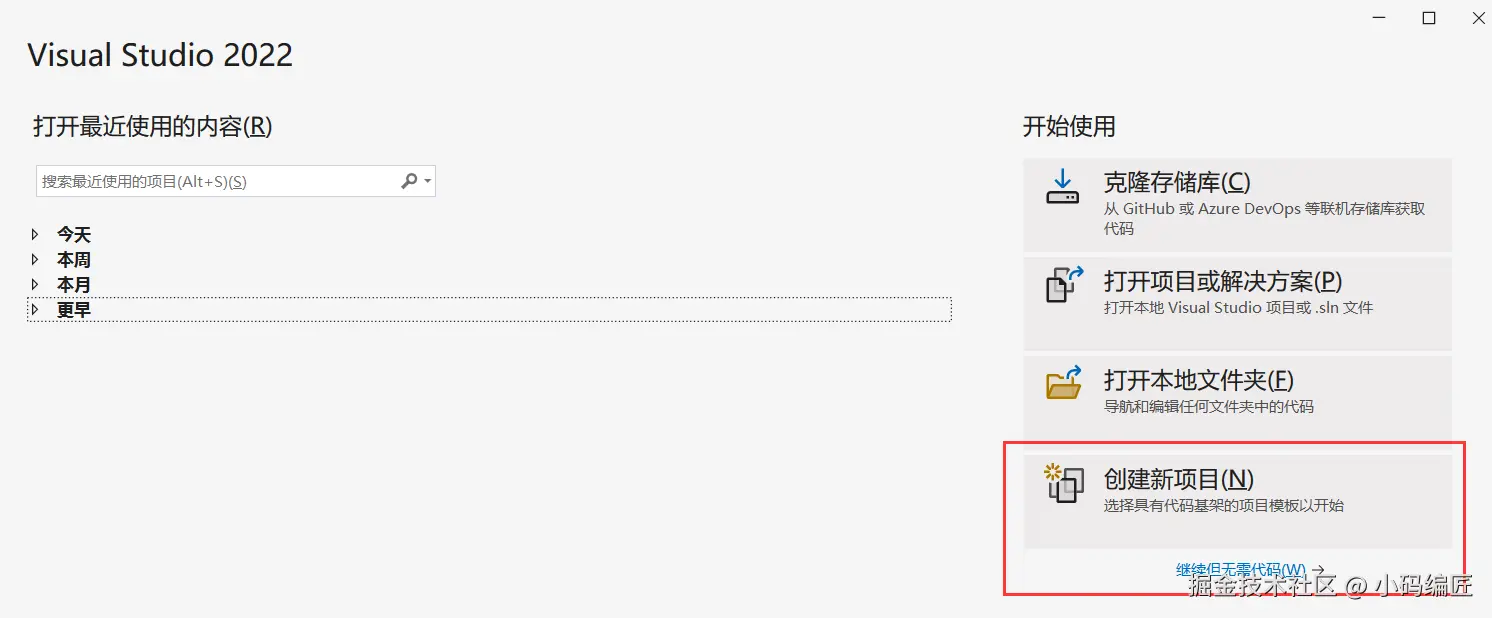 2、如果尚未创建或打开项目,可以选择"创建新项目”或”打开现有项目”来启动Visual Studio,具体如下图所示: