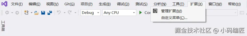 在Visual Studio 顶部菜单中,点击"扩展" > "管理扩展",具体如下图所示: