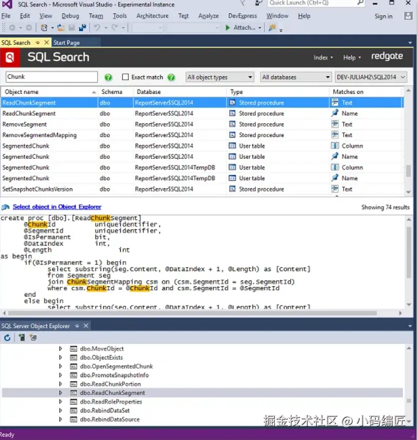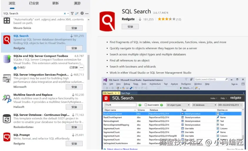 SQL Search 是由 Redgate 软件公司开发的一款 SQL Server Management Studio (SSMS) 和 Visual Studio 的插件,其主要功能是在 SQL Server 数据库中快速搜索 SQL 代码和文本。