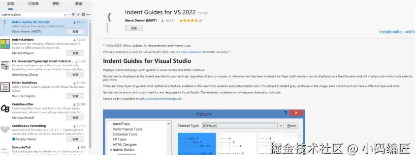 安装和使用:Indent Guides 可以直接从 Visual Studio 的扩展管理器中搜索并安装。一旦安装,它会自动应用于所有支持的语言项目中,但在某些情况下可能需要重启 Visual Studio 才能使更改生效。