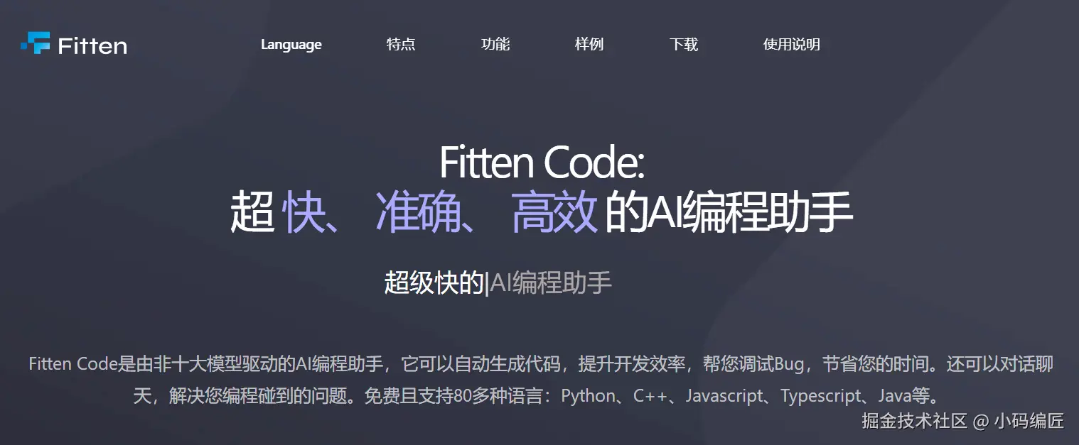 Fitten Code 是由非十大模型驱动的AI编程助手,支持多种编程语言,支持主流几乎所有的IDE开发工具。
