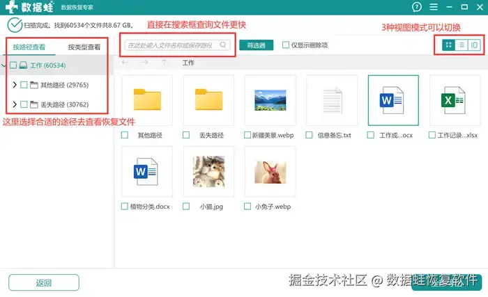步骤3: 结果出现后,页面的左边分为【按路径查看】和【按类型查看】,您可以根据不同路径去查找目标文件。如果用户想要更加省时省力,则可以直接通过搜索框直接输入文件类型或保存路径,更加高效迅速找到目标文件。
