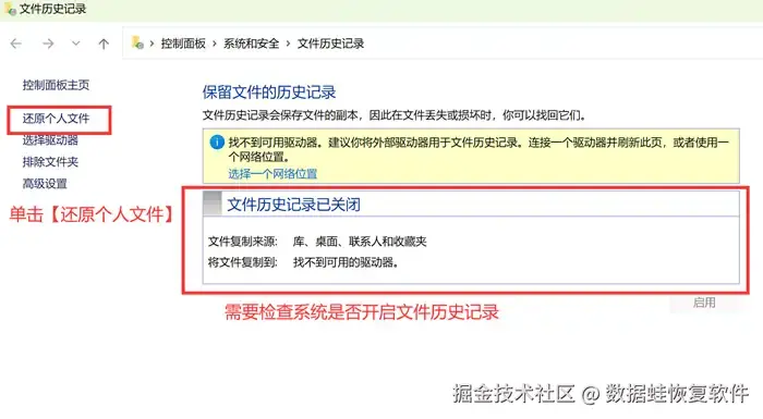 恢复删除的文件方法2:系统的文件历史记录备份