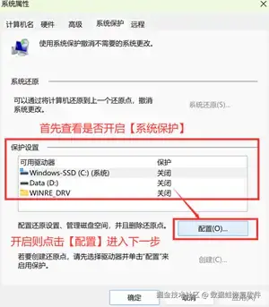 进入电脑【设置】,在设置的搜索框内直接搜索【系统还原】。点击【创建还原点】这一栏目后就会弹出【系统保护界面】。在这一页面可以查看该功能的状态,如显示开启,则点击【配置】后进入新页面按照指示继续操作;如未开启则可以直接忽略这个方法。