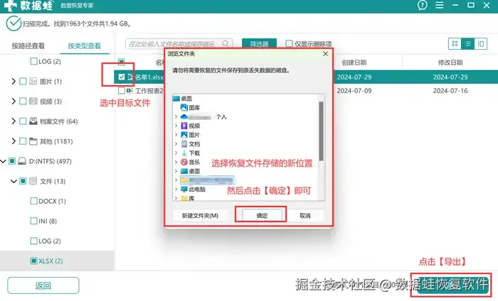 步骤4: 选定文件后,点击【导出】,弹出【浏览文件夹】的界面后,选择保存恢复文件的路径,完成选择后点击【确定】,即可恢复删除的文件。