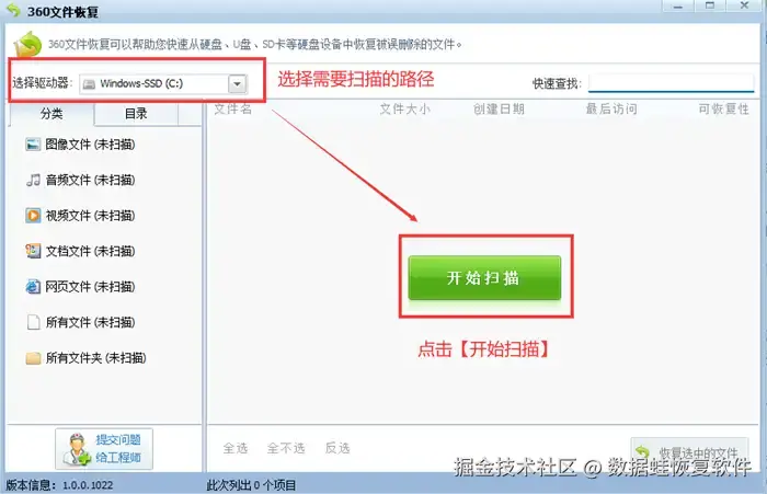 第2步: 在左上的条框选择需要扫描的路径,然后点击绿色方块的【开始扫描】。