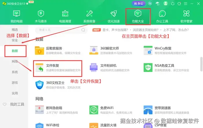 第1步: 点入360安全卫士的主页面后,点击【功能大全】;再选择位于左边的【数据】,点击【文件恢复】功能。