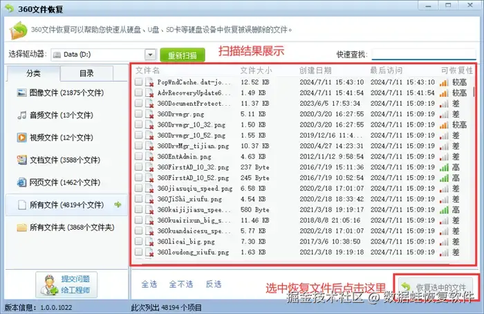 第3步: 扫描结果出现后可见,360的文件修复功能能够展现出恢复文件的大小、创建日期、最后访问日期和文件恢复的可能性评估。但乱码的文件名,会给用户寻找定位目标恢复文件带来不小的麻烦。选中文件后,点击【恢复选中的文件】即可恢复删除的文件。