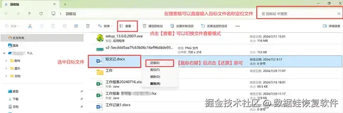 恢复删除的文件方法1:回收站的文件还原功能