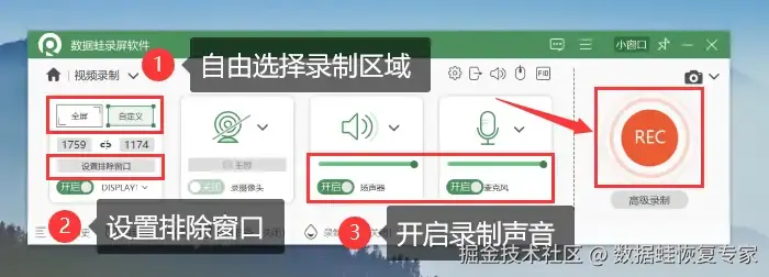第二步:对录制区域、排除窗口、录制声音等进行调节,调整完毕即可点击红色录制按钮 【REC】 进行录屏。