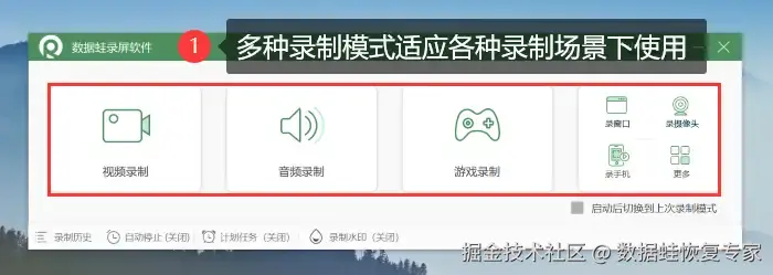 除了以上两种录屏方式外,Win10录屏软件还可以使用专业的录屏软件——数 据 蛙录屏软件。使用该软件进行Win10电脑录屏有着更多的好处。比如拥有多种录屏模式、画质调节、音频设置等高级功能。同样支持自定义录制电脑窗口画面、游戏画面、摄像头画面等多种模式,可以满足不同用户的录制需求。