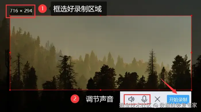第二步:打开录屏功能后,框选好录制范围以及调节录制声音,点击 【开始录制】 即可录屏。