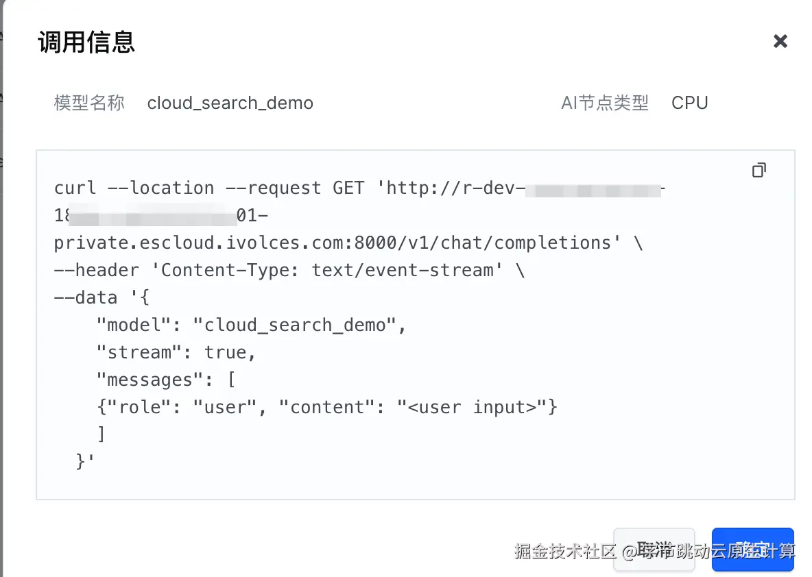 创建完成后进入服务列表就可以获取到公网访问域名,拼接 RAG 推理服务的完整访问地址,格式为 http://[url]/?model=[model_name],其中 url 替换为在 API 网关中获取到的服务公网访问域名,model_name 替换为 RAG 模型的名称后就可以在浏览器中通过刚才拼接好的固定域名访问 RAG 推理服务,并在可视化页面中咨询本文所用到的云搜素服务文档库的相关问题。