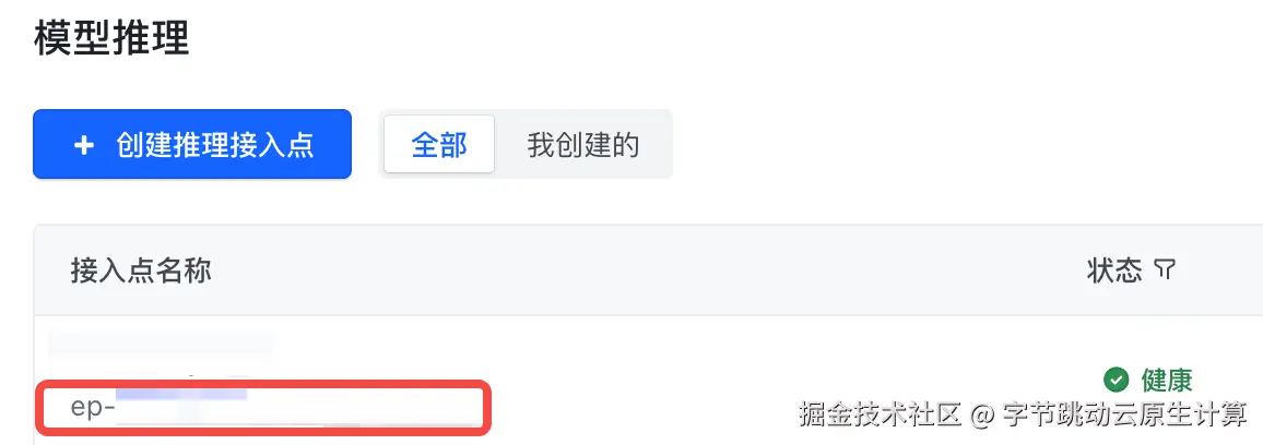 - 进入火山引擎方舟控制台,在模型推理下创建推理接入点,接入模型建议选用 Doubao-pro-32k(或者Doubao-lite-32k),创建完成后可以获取到接入点 Endpoint。