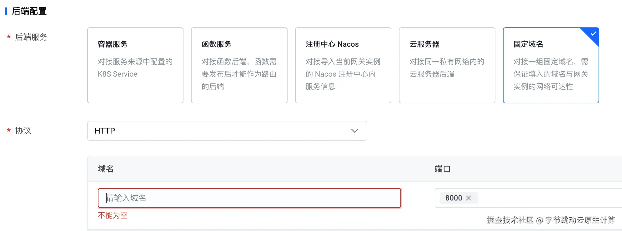 - 接下来创建 Upstream,后端服务选用固定域名,域名和端口从刚刚启用的 RAG 调用信息内获取。
