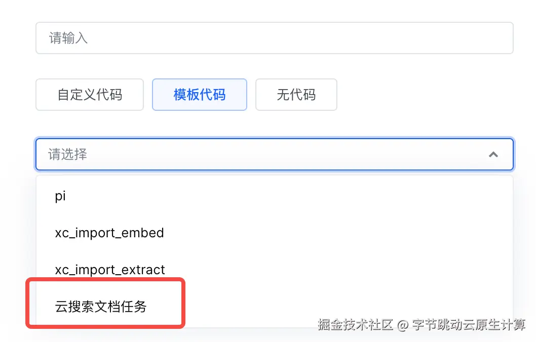 - 这里演示为基于火山引擎云搜索服务文档语料搭建的推理任务,所以在创建任务时选择模板代码-云搜索文档任务,大家在具体使用中可以根据需求用其他语料库进行搭建。