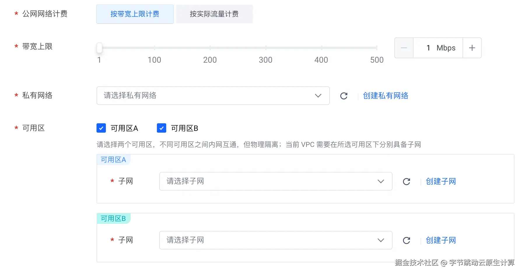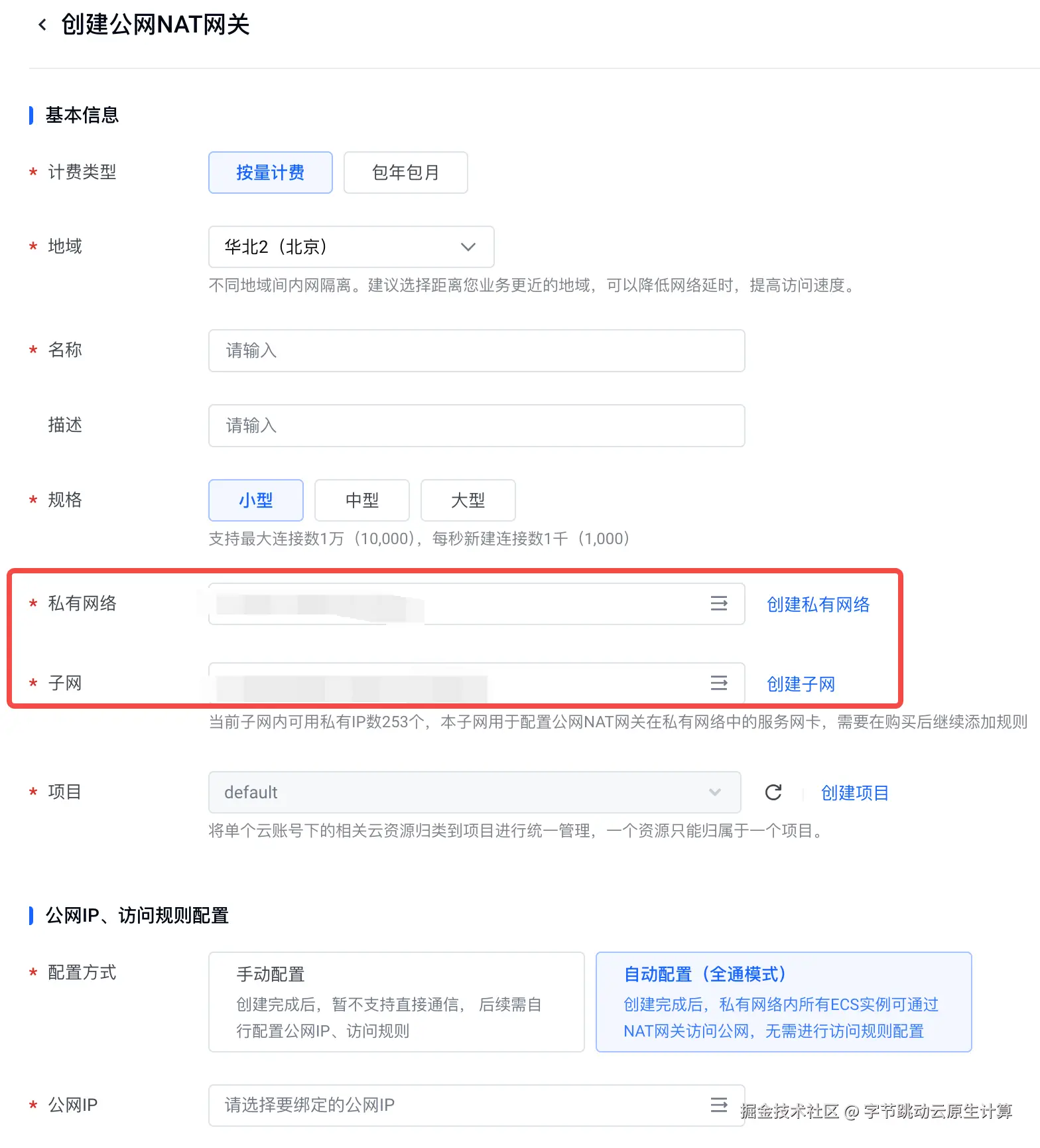 首先进入火山引擎 NAT 网关控制台,创建公网 NAT 网关。这里需要注意私有网络和子网一定要和云搜索服务实例所在的网络保持一致,可选用自动配置或手动配置: