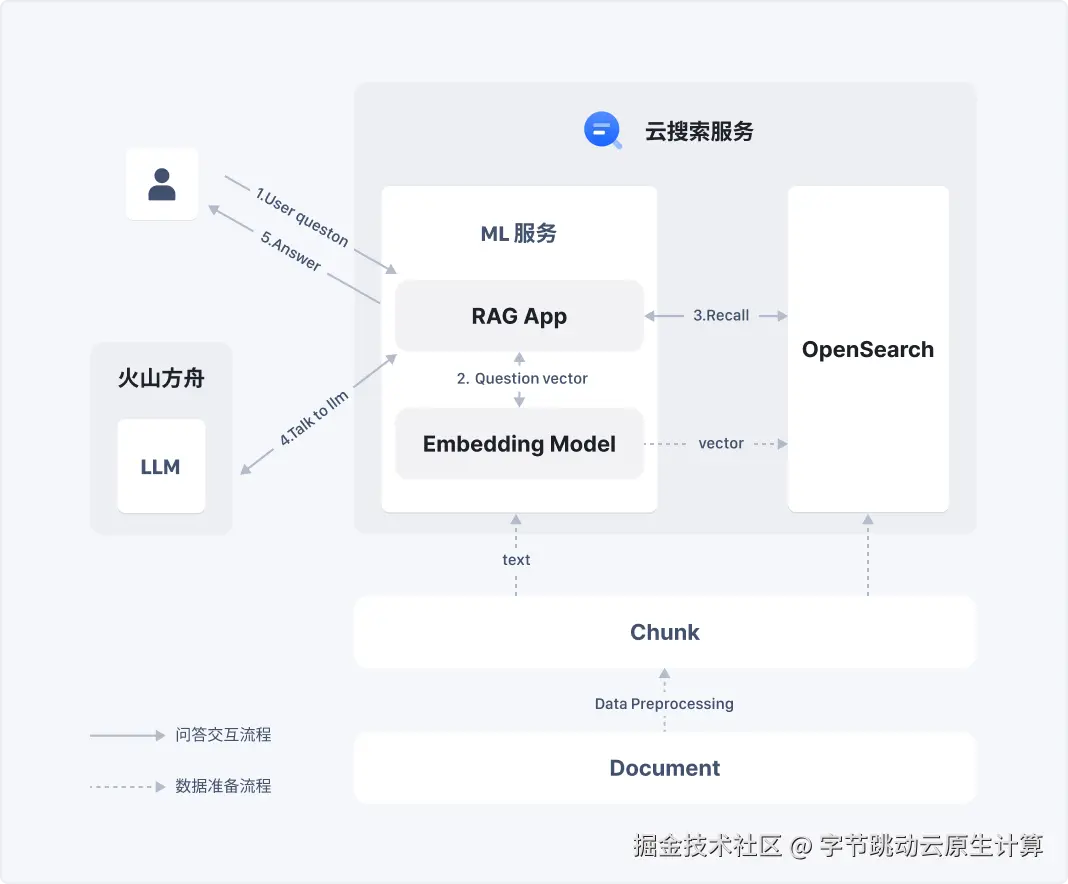 本文将介绍如何基于火山引擎云搜索服务和方舟平台来构建专属的 RAG 智能问答系统。系统使用 OpenSearch 作为外部知识库,火山豆包作为大语言模型,全流程构建在火山引擎平台上。本次实践采用的语料为火山引擎云搜索服务知识库,将语料处理后存入 OpenSearch 索引中,同时通过部署在云搜索服务 ML 节点上的 Embedding 模型,将原始语料额外转化为向量字段存储在同一个 OpenSearch 索引中,方便后续做混合查询召回。