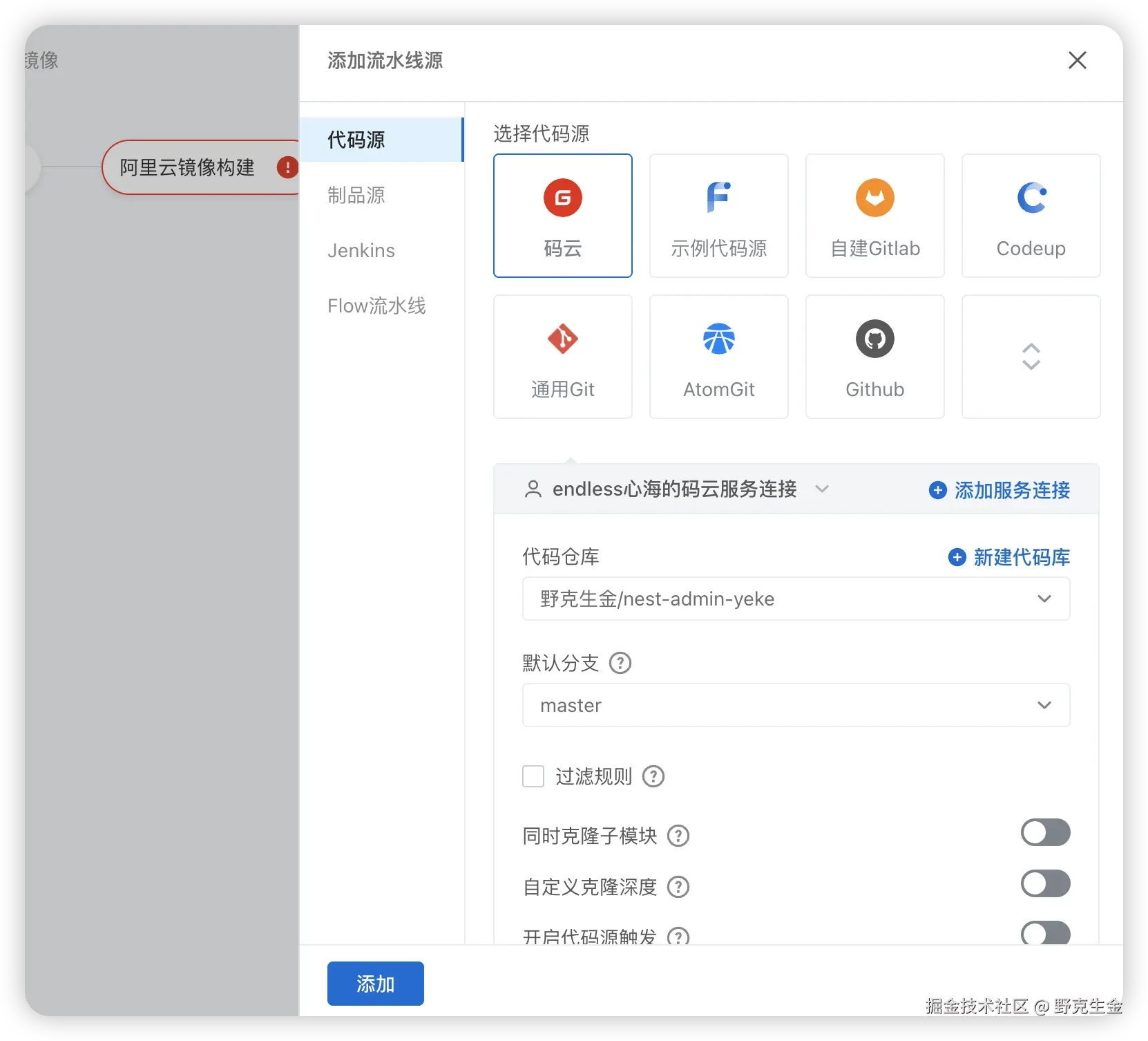 接下来选择仓库和分支,点击添加: