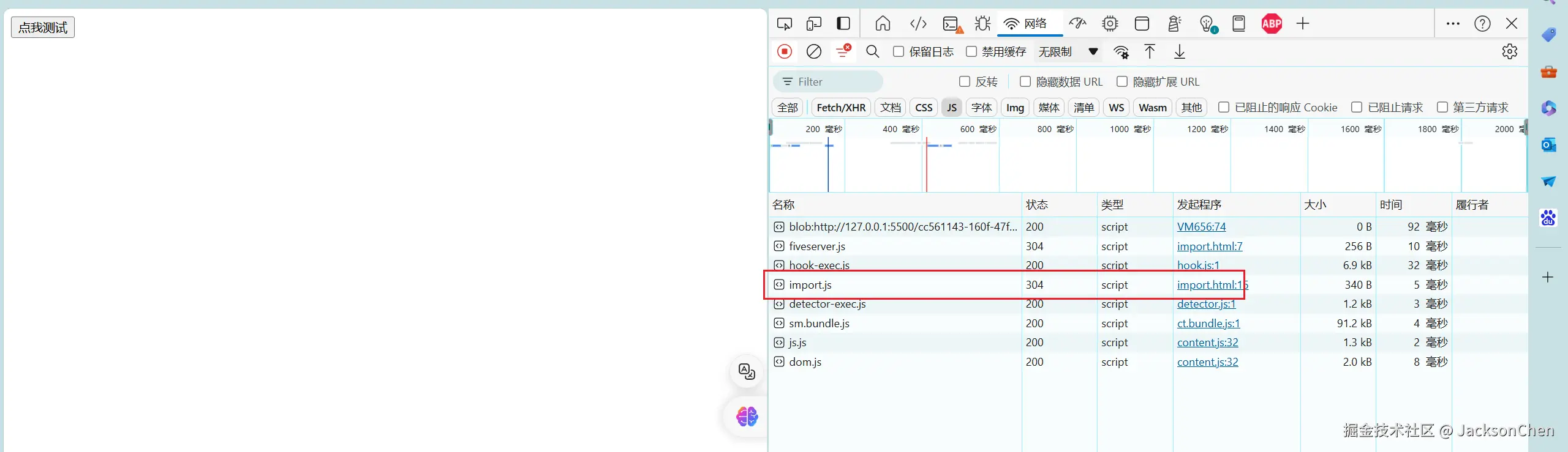 当点击按钮时,才加载了 import.js 文件,这就说明import导入的文件不会一上来就直接被加载,而是在相关代码被执行时才进行加载的。