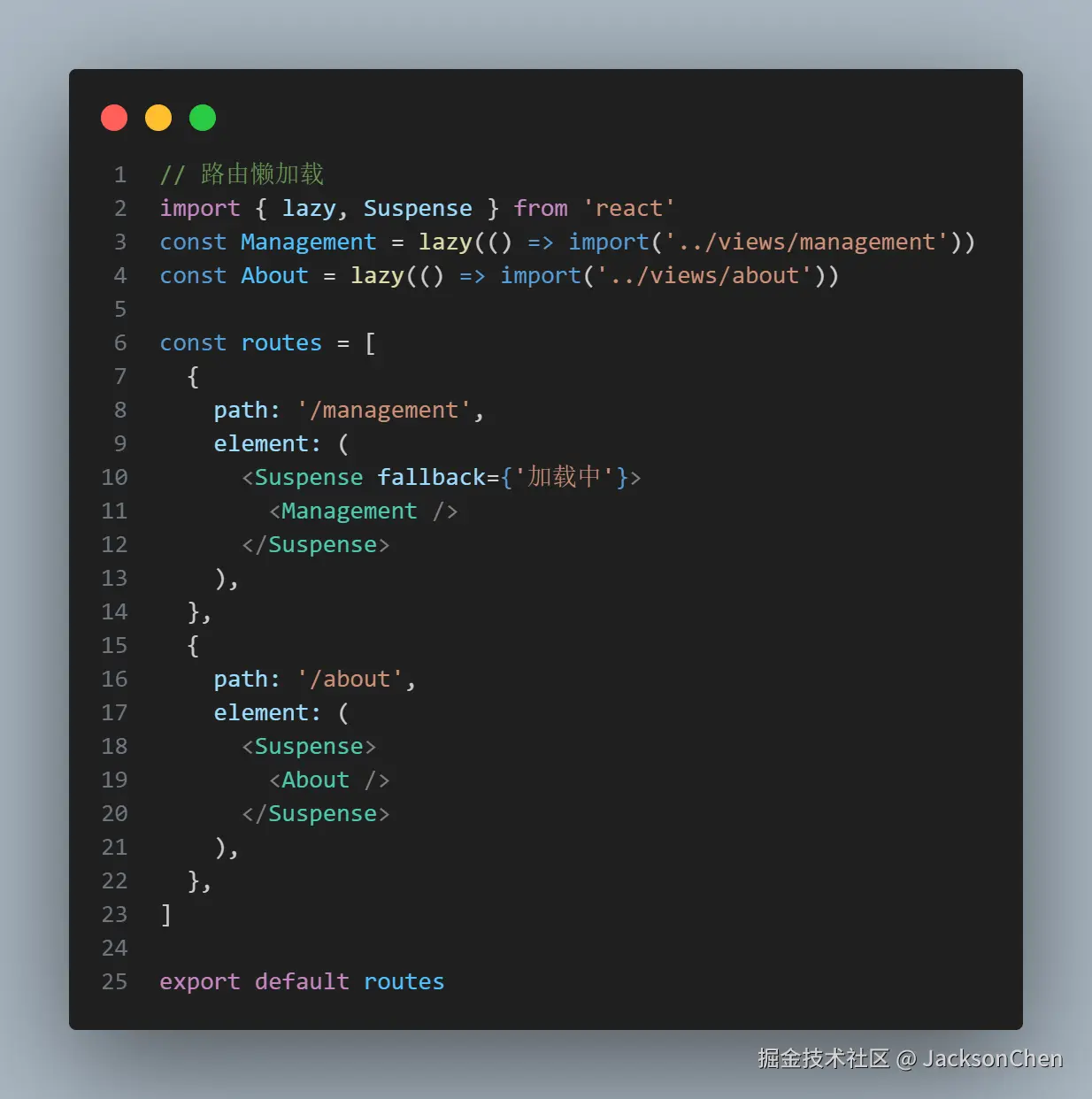 在 react 中我们常常使用 lazy 和 Suspense 来实现路由的懒加载,这样做的好处就是初始化时不会一下加载所有的页面,而是当切换到相应页面时才会加载相应的页面,例如: