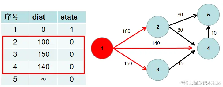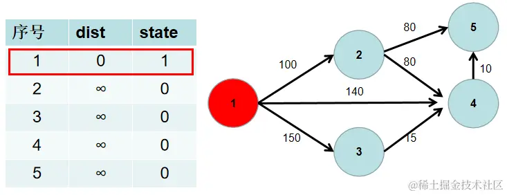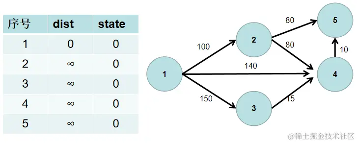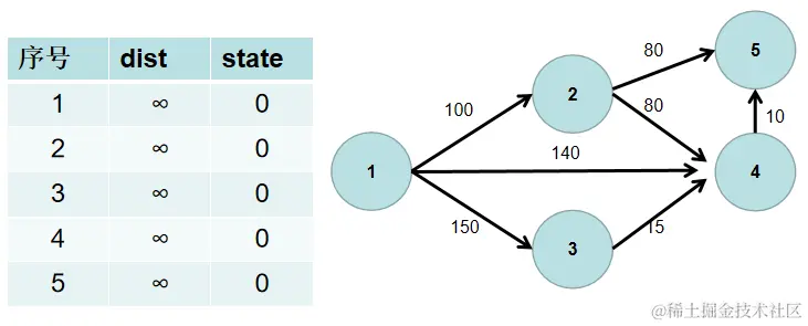 用一个 dist 数组保存源点到其余各个节点的距离,dist[i] 表示源点到节点 i 的距离。初始时,dist 数组的各个元素为无穷大。 用一个状态数组 state 记录是否找到了源点到该节点的最短距离,state[i] 如果为真,则表示找到了源点到节点 i 的最短距离,state[i] 如果为假,则表示源点到节点 i 的最短距离还没有找到。初始时,state 各个元素为假。