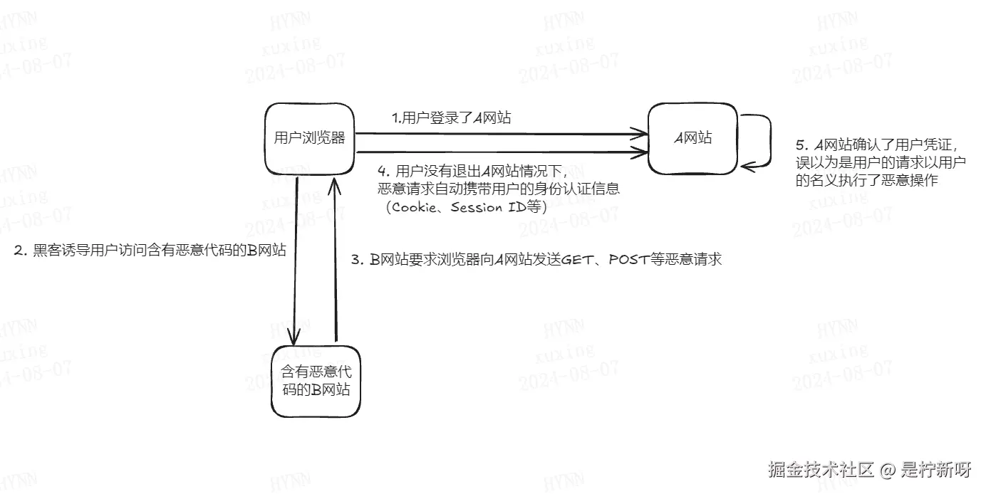 - A网站确认了用户凭证,误以为是用户的请求以用户的名义执行了恶意操作😱。(黑客因此会转走你的钱💲、通过邮箱收发你其他网站的验证码、严重点的还可以让你自动给我的文章点赞、收藏😉)
