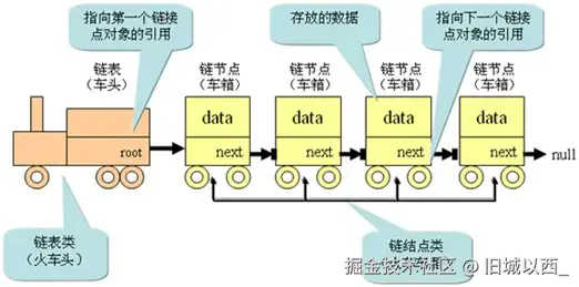 链表的每个元素由一个存储元素本身的节点和一个指向下一个元素的引用 (有些语言称为指针) 组成。