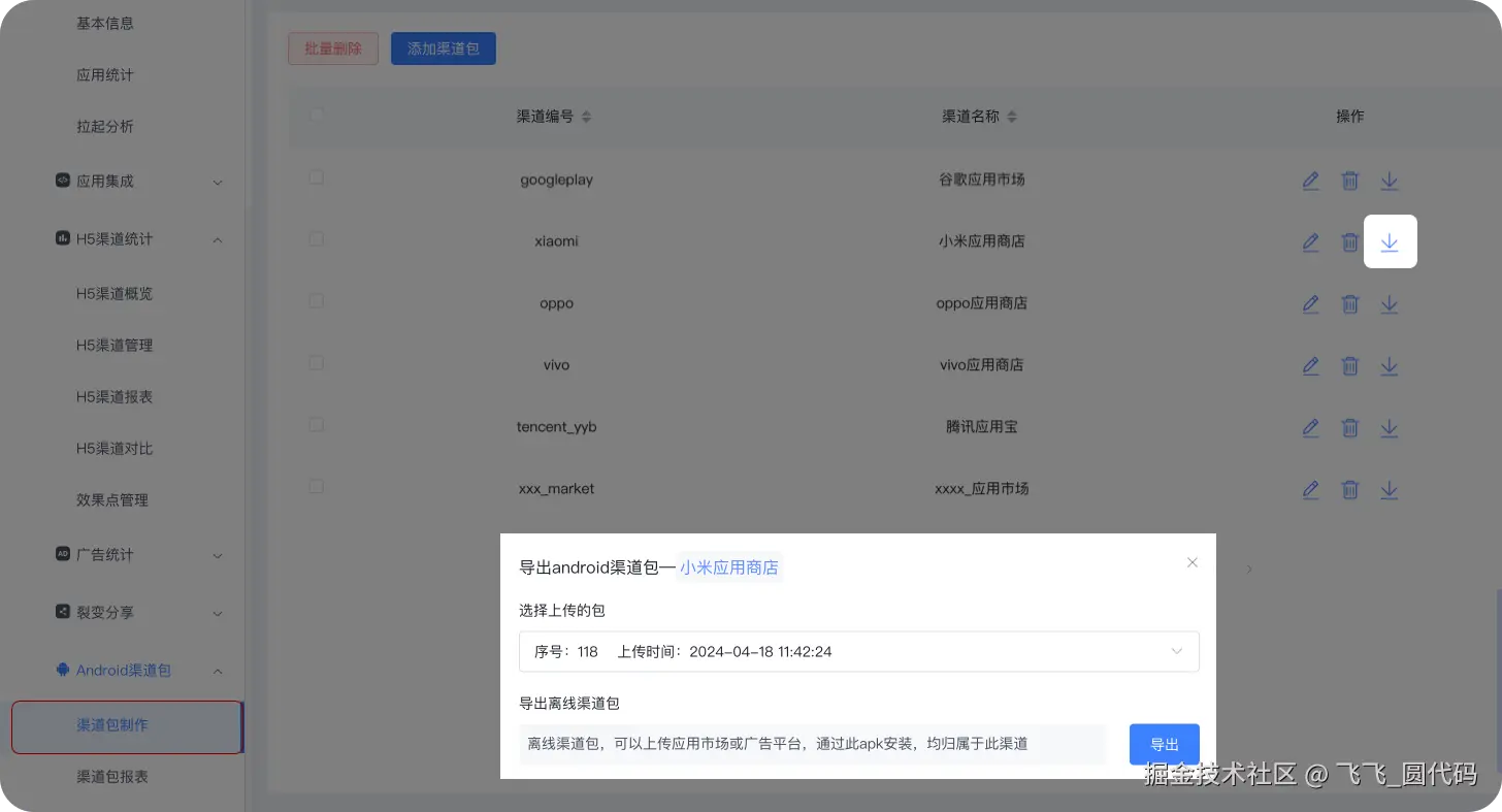 当然市面上也有不少打包工具,比较简单的可以用openinstall上传一个标准安装包,然后根据需求一键导出多个渠道包进行分包统计。