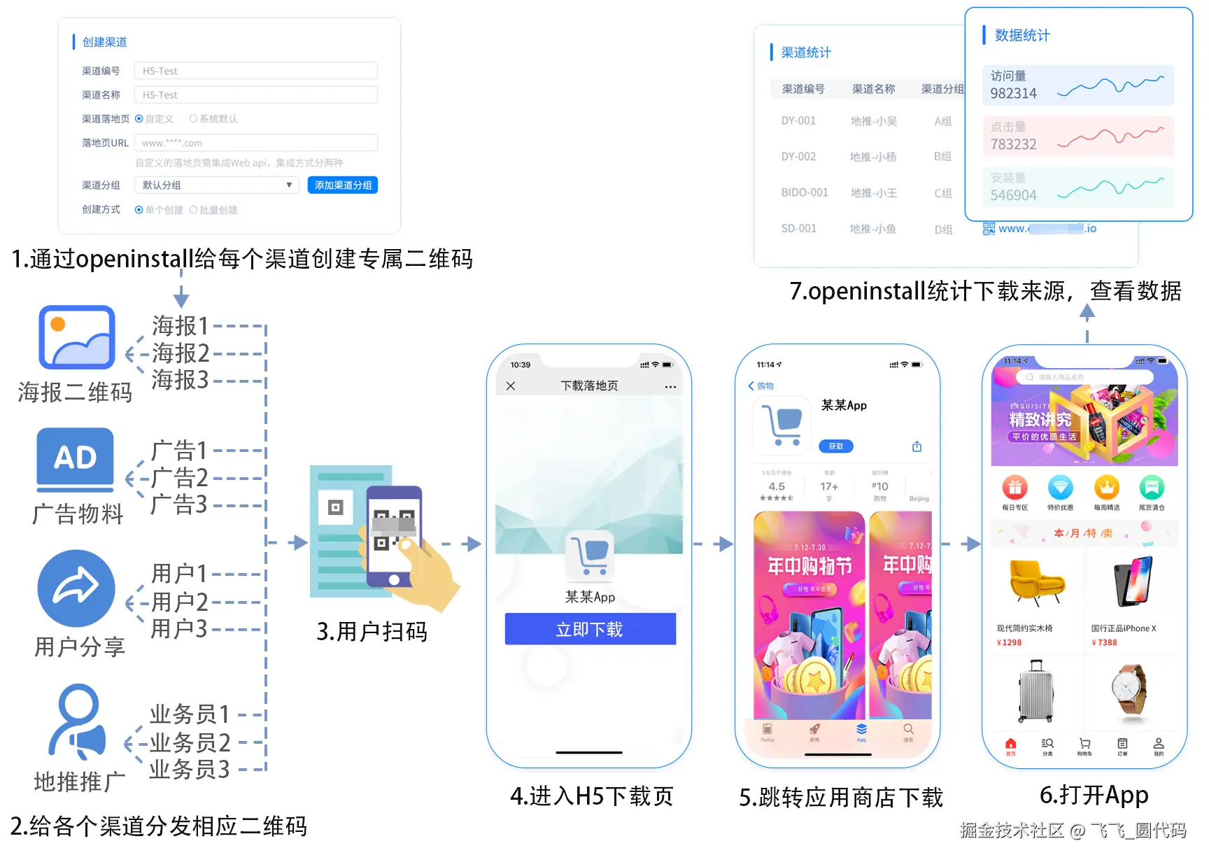 每个渠道链接的参数是专属的,用来判断渠道来源,只需要第三方从中间落地页环节收集到设备ID信息即可,随后会通过链接跳转到应用商店安装,整个流程用户的体验跟正常安装一样。