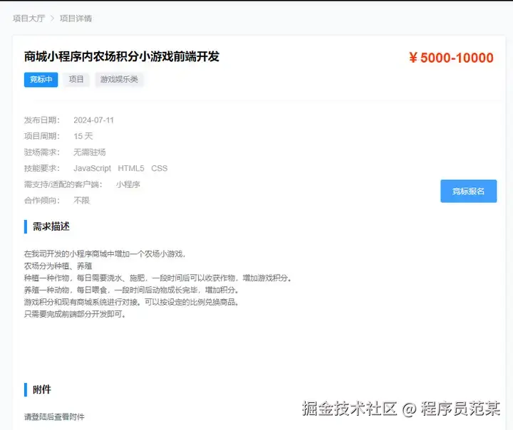 开源众包上的前端项目,对于需求描述还是比较清晰的,会展示当前的项目进程和项目周期,在竞标报名后,得标就可以进行开发工作了。开源众包上的私活的质量还不错,不过页面ui做得比较简陋,如果遇到需求描述不清晰的项目,记得要提前进行咨询和项目功能确认,以防被坑。