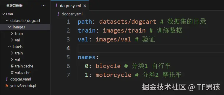 首先,我们需要准备数据,并建立一个yaml文件。我们志向不大,以摩托车和自行车这两类交通工具的OBB检测为例。新建一个dogcart.yaml文件,里面说明训练的关键信息:
