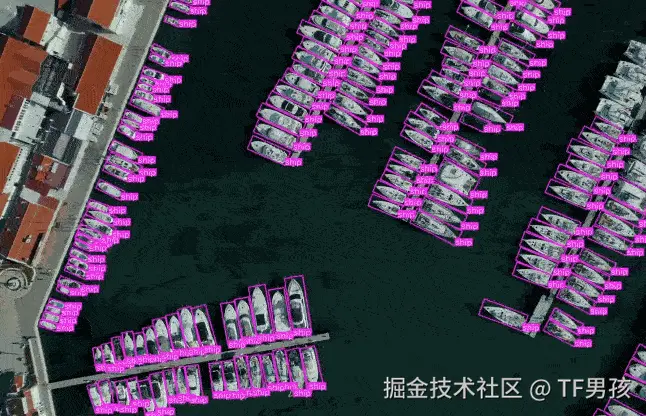 但是实际上这不准确,我们更想要下面这样。它可以框出物体的实际矩形轮廓,而且紧紧贴合角度的变动。因为这样可以做很多事情,比如它识别船头船尾,判断行进方向,甚至预测他们是否会发生碰撞。