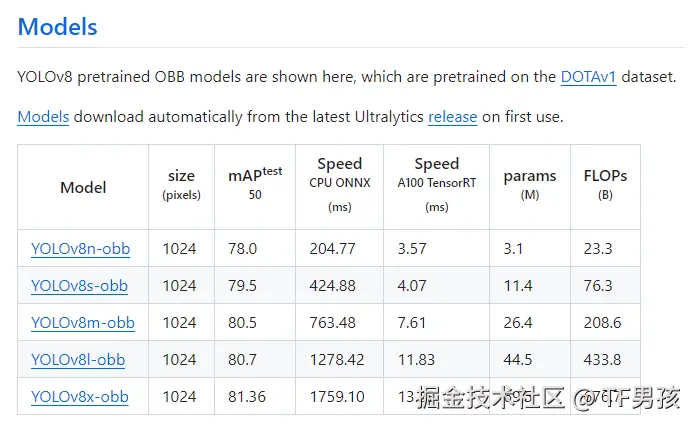 里面的yolov8n-obb.pt怎么来的?那肯定是YOLO官方提供的,你可以直接下载。跟衣服一样,各种尺寸(X、L、M、S)都有,适用于不同设备和场景。