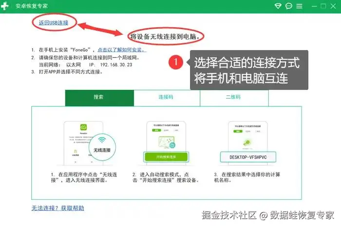 步骤2:支持多种连接方式。 手机和电脑之间可以使用有线连接,无线连接也有多种方式,满足用户在不同情况下的连接。