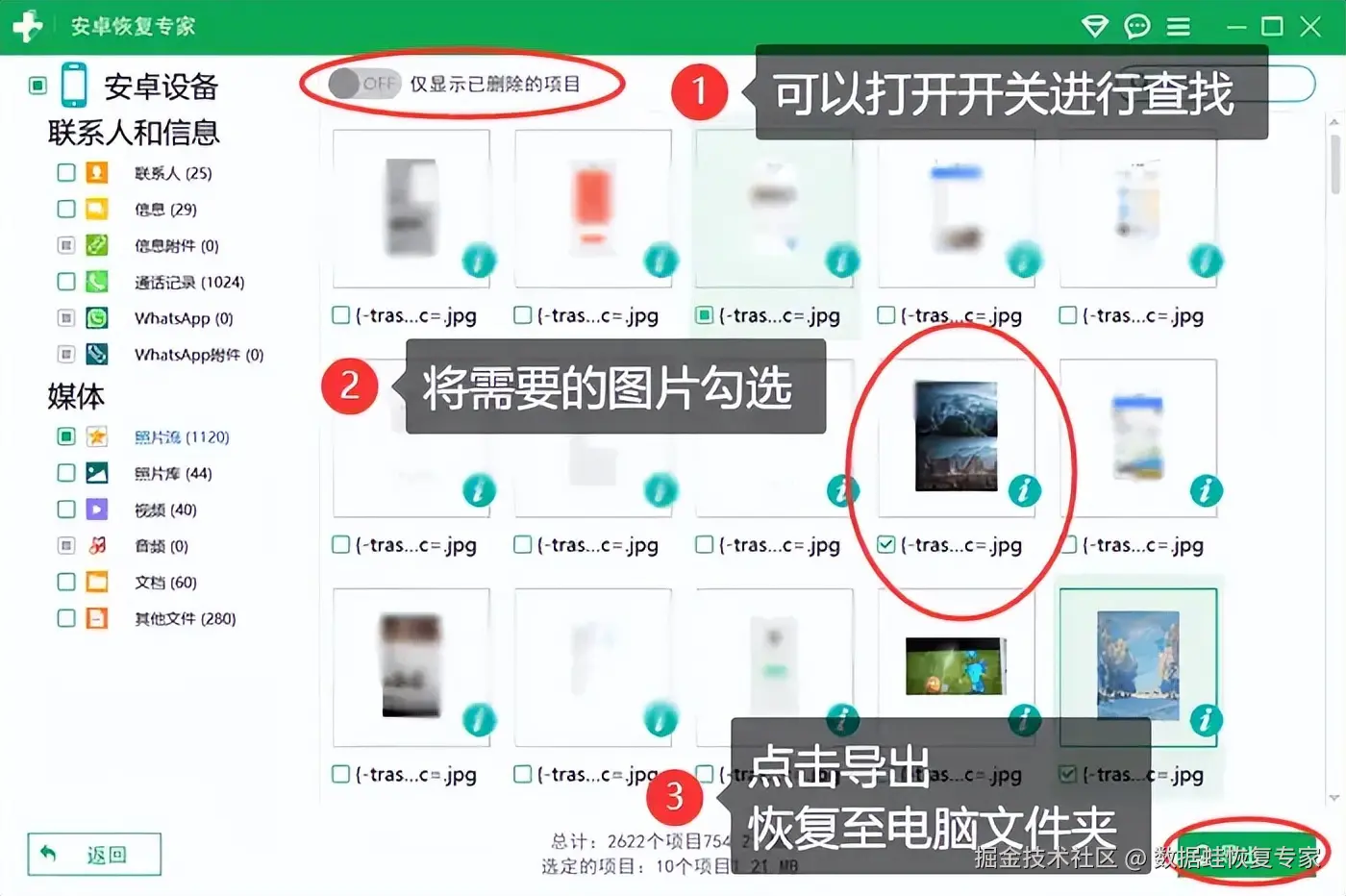 如果你发现回收站已经被清空,或者你的手机根本就没有这个功能,那么图库里的照片怎么恢复呢?是时候请出我们的大杀器——专业数据恢复软件了!比如【数据 蛙安卓恢复专家】,它就像一名侦探,能够深入手机的内部,快速扫描出指定的数据,将它们呈现在我们眼前,尝试帮助你恢复。接下来,我们就来详细介绍它的优点以及如何使用它来恢复你的照片。