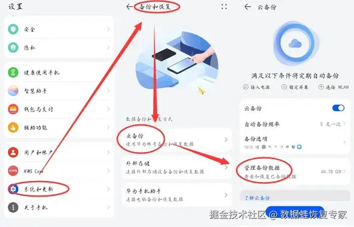 步骤2:进入云备份后,我们可以查看 【备份选项】 ,确认图库已经同步至云端。接着,查看备份的数据,将图片恢复至手机。