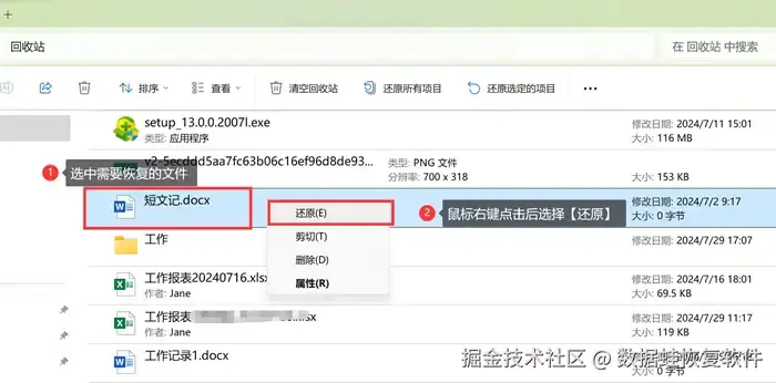 双击点击【回收站】的图标,尝试寻找被自己意外删除的文件。找到后鼠标右键点击,选择【还原】选项即可。