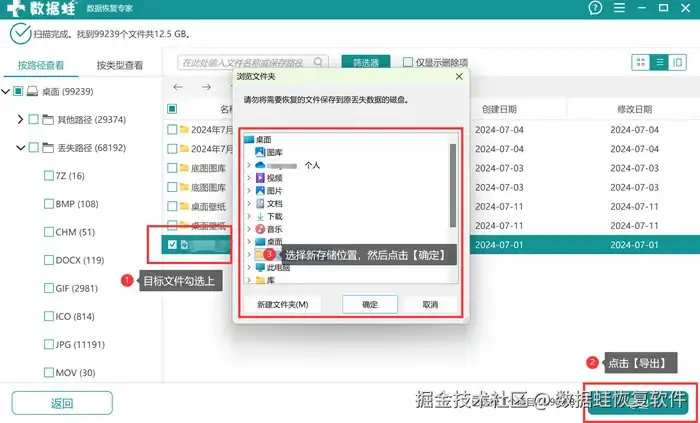 第4步: 选择好目标文件后直接单击【导出】,然后再选择恢复文件的新存储位置即可。