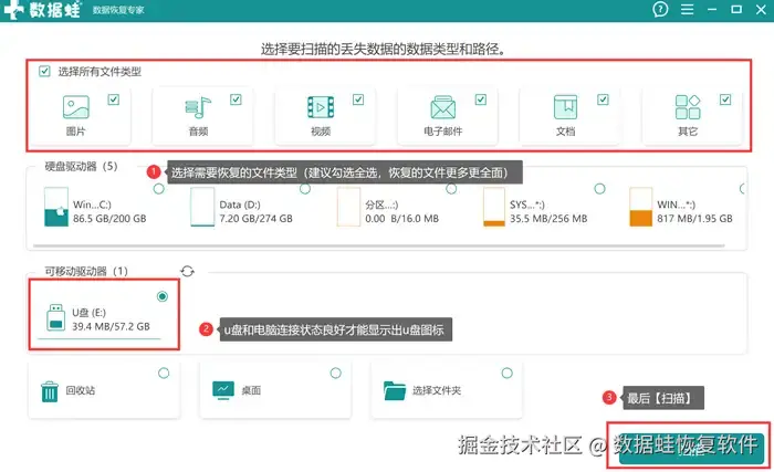 第2步: 在软件的主页面上选择好需要扫描的文件,再选择数据丢失的u盘,最后点击【扫描】。
