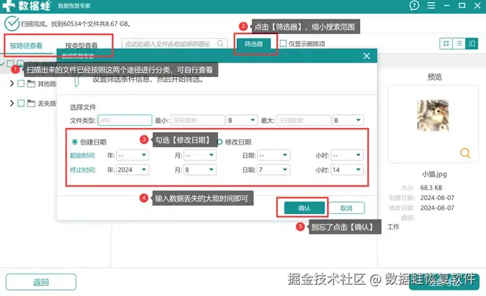 第3步: 扫描完出现结果,您可以选择【按路径查看】或【按类型查看】扫描出来的文件,也可以用【筛选器】选择数据丢失的时间进行文件范围的限制。