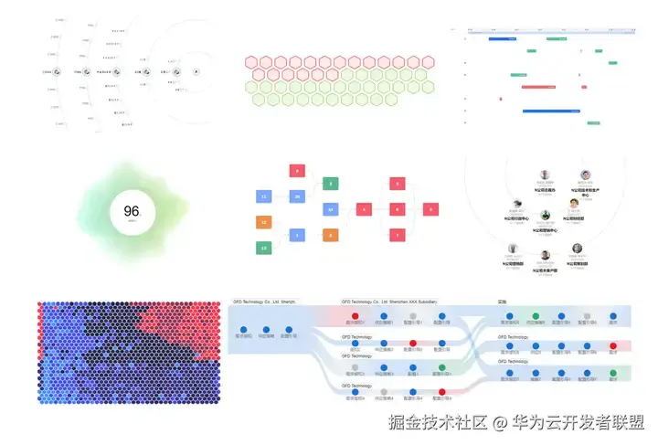 OpenTiny HUICharts 提供了传统图表库不包含的复杂可视化图表组件,图表包含自研算法布局和图形绘制。