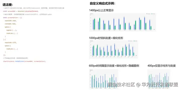 传统的图表库自适应通常是简单的图元缩小,OpenTiny HUICharts 提供了可定制化图表响应式能力,并提供语法糖。