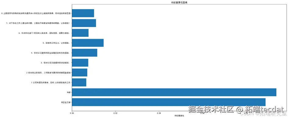 - 例如,如果“岗位”特征在图表中具有较高的重要性得分,这表明它在决定员工满意度方面起着关键作用。