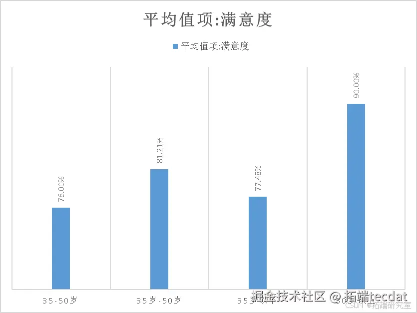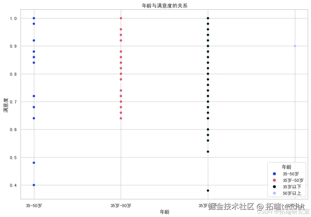 - 散点图:揭示了年龄与满意度之间的关系,不同年龄组使用了不同的颜色。