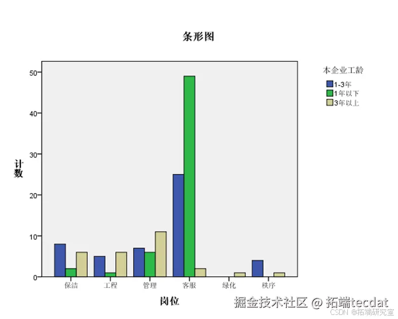 不不同工龄人群岗位满意度比较百分比柱形图更能说明两者满意度的差异。从结果来看, 满意度最高的是1年以下的客服员工。而管理职位中,满意度最高的是3年以上工龄员工,说明不同职位和不同年龄段的员工的满意度是有差异的。